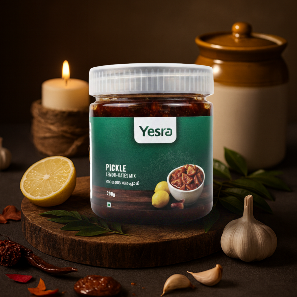 Experience the authentic taste of Kerala with YESRA Lemon–Date Mix Pickle, a unique combination of tanginess and natural sweetness. Crafted by a passionate home pickler, this pickle is prepared using handpicked lemons and soft, premium-quality dates for a rich, flavour-packed mix.